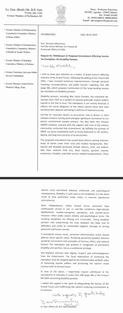The Finance Bill, 2026 has proposed to terminate income-tax benefits accruing from disability pension to those soldiers who have served and superannuated with disabilities.