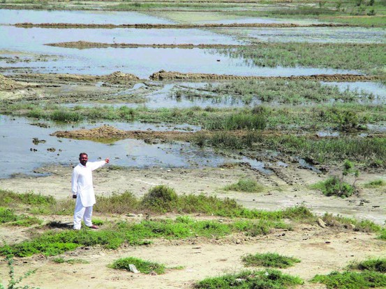 A farmer points to a pool of drained out water in a vast stretch in Fazilka. Tribune Photo