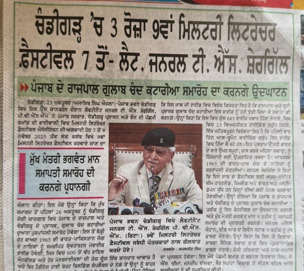 Lt Gen T. S. Shergill, PVSM, announced that the 9th Military Literature Festival (MLF), Chandigarh, will be held at the Lake Club from November 7 to 9 under the aegis of the Military Literature Festival Association in partnership with the Punjab Government, the Chandigarh Administration, and the Indian Army’s Western Command.