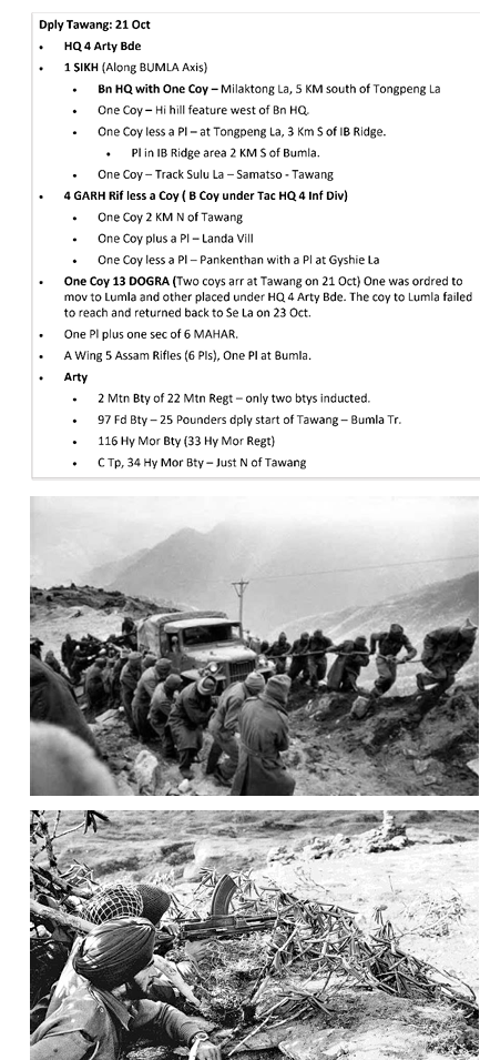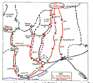 Advance along three different routes culminating in a three-pronged attack on Tawang. Force 419 (comprising three Infantry Regiments), 11 Infantry Division and four coys ex Shanan Military Sub District (SMS): roughly a total str of six infantry regiments were tasked for the capture of Tawang. (A PLA regiment comprised approx 2,500–3,000 troops, organized into three infantry battalions, supported by heavy weapons, logistics, and command elements). The outline plan: • Force 419 to advance from Lumpu via Lumla in the South West and capture Tawang in coord with 11 Infantry Division. • 1st Bn of 31 Infantry Regiment advance from Takson Gompa via Gangshen Pass directly to Tawang and assist Force 419 advancing from the West for capture of Tawang. • 33 Infantry Regiment of 11 Infantry Divison advance along Eastern flank from Bumla via Mukdong La directly to Tawang Chu and cut off route of withdrawal from Tawang, as also prevent any reinforcement. • 32 Infantry Regiment of 11 Infantry Divison and four coys of Shanan Military Sub District to advance on the main Axis Bumla – Tawang via Milakteng La and coord their actions with both the forces advancing on the West and East flanks. Having secured Lumpu and Ziminthaung, Tibet Military Command at 4.30 PM on 22 Oct, ordered troops ex SMS to capture Bumla and exploit to Tawang. The attack commenced at 5 AM on 23 Oct from Bumla and faced stiff opposition from the 1st SIKH platoon under Sub Joginder Singh. The Chinese had to call for reinforcements from 33 Infantry Regiment and readjust their plans. Having eliminated the platoon at Bumla, 33 Infantry Regiment troops continued their attack against the SIKH coy at Tongpengla which managed to make a clean break and withdraw to Jung in good order.