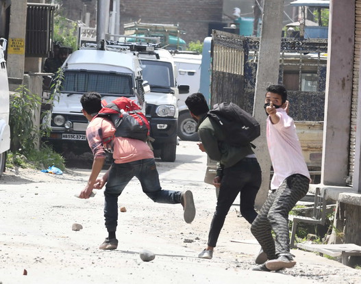 Locals pelt security forces with stones after the encounter broke out in Srinagar. Tribune photo: Amin War