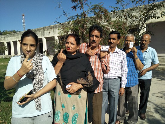 Kashmiri migrants show their inked fingers after casting vote at a polling station on the outskirts of Jammu on Sunday. Tribune photo: Inderjeet Singh