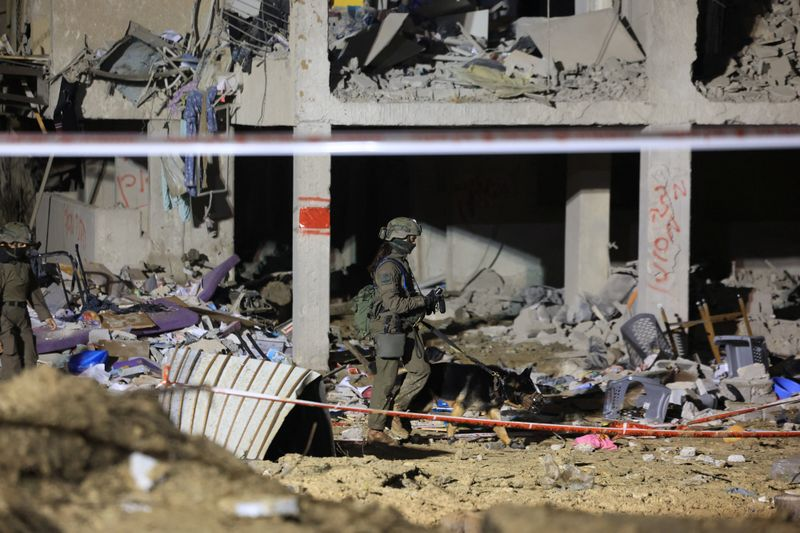 Israeli soldiers work at the scene of damage after Iranian missile barrages struck residential buildings in Arad, amid the U.S.-Israel conflict with Iran, in southern Israel, March 22, 2026. REUTERS