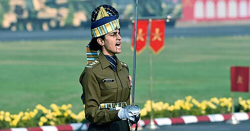 While celebrations take place across the country, the main Army Day parade is conducted in Cariappa Parade ground in Delhi cantonment.[7] Gallantry awards and Sena medals are also awarded on this day. In 2020, 15 soldiers were presented with bravery awards. Param Vir Chakra and Ashok Chakra awardees participate in the Army Day parade every year.[8][9] Military hardware, numerous contingents and a combat display are part of the parade.[8] In 2020, Captain Tania Shergill became the first female officer to command an Army Day parade.[10][11