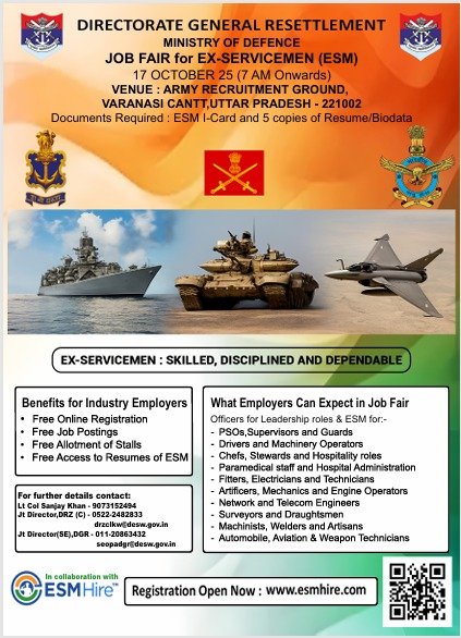 Directorate General of Resettlement (DGR) will be organising an “Ex-Servicemen Job Fair” in #Varanasi, Uttar Pradesh. The Ex-Servicemen Job seekers may avail this opportunity for hassle-free recruitment.