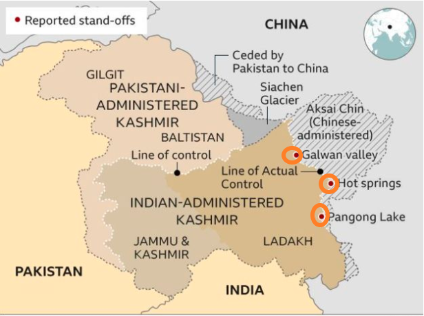 Look at the map where there is a current military conflict with China in Ladakh region.